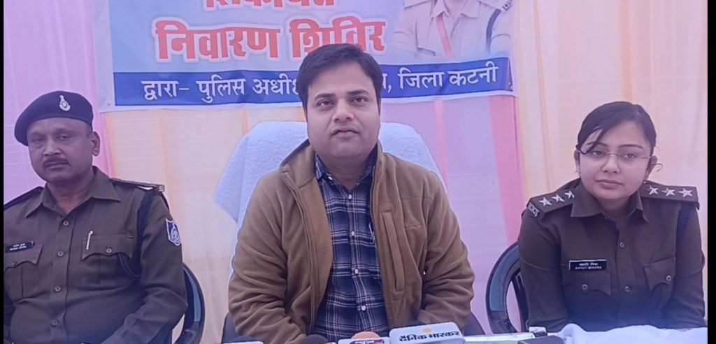 कटनी पुलिस अधीक्षक अभिजीत रंजन की सरहानीय पहल पर मंगलवार को कोतवाली थाना परिसर में शहरी व ग्रामीण थानो के क्षेत्र में लगी सीएम हेल्पलाइन की शिकायतों का निराकरण करने शिविर लगवाया गया शिविर में मोके पर ही पीड़ित शिकयत कर्ता की शिकायत का निराकरण करने के सरहनीय प्रयास से कटनी जिले की सीएम हेल्पलाइन की शिकायतों के निराकरण पर प्रथम स्थान प्राप्त हुआ है। लगाए गए निराकरण शिविर में पीड़ित शिकायत कर्ताओ की बात सुन तत्काल संबंधित थाने की शिकायत पर पुलिस कप्तान ने संबंधित थाने के थाना प्रभारी के सामने पीड़ित की शिकायत का निराकरण किया।