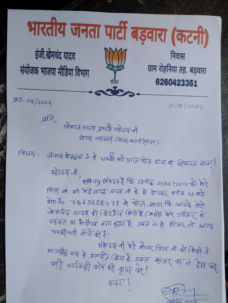 बता दें कि बड़वारा थाना क्षेत्र के ग्राम रोहनिया निवासी भाजपा मीडिया विभाग के संयोजक खेमचन्द यादव के पिता के पास अनजान नंबर से कॉल आया और बोला गया की आपके बेटे को हमने किडनैप कर रखा है हला कि किडनैपिंग की घटना झूठी निकली चूंकि जिसके नाम पर धमकी दी गई थी वो सुरक्षित अपने गांव में हैं इस सम्बंध को लेकर खेमचंद यादव ने थाना प्रभारी से इसकी शिकायत करते हुए कहा कि मेरे को और मेरे परिवार को मानसिक रूप से प्रताड़ित किया जा रहा जिससे भय का माहौल बना हुआ है वही इस सम्बंध को लेकर पीड़ित युवा नेता खेमचंद यादव ने बड़वारा थाना प्रभारी को अपने लेटर पेड के साथ लिखित आवेदन देते हुए दोषी पर कड़ी कार्यवाही की मांग की है। बहरहाल बड़वारा पुलिस द्वारा भाजपा नेता के आवेदन के आधार पर जांच सुरु कर दी गई है।
