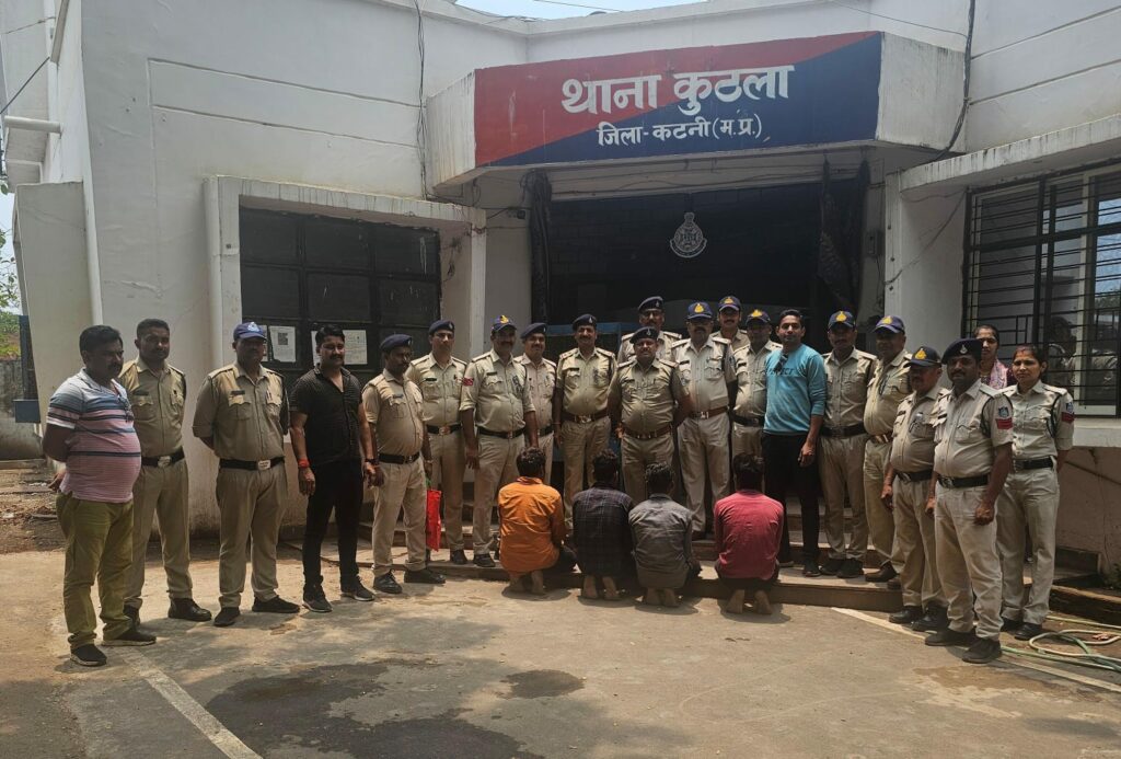 गिरफ्तार आरोपी – आशीष सिंह ठाकुर पिता स्व देवी सिंह ठाकुर उम्र 28 वर्ष, विनोद सिंह पिता ज्ञान सिंह उम्र 35 वर्ष, रंजीत उर्फ गोलू सिंह पिता देवी सिंह उम्र 24 वर्ष, सनम सिंह पिता वीरेन्द्र सिंह उम्र 19 वर्ष सभी निवासी कछगवा थाना कुठला जिला कटनी