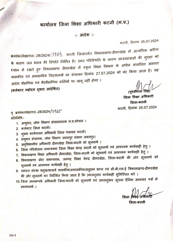 कटनी ।जिले के विकासखण्ड ढीमरखेड़ा में अत्यधिक बारिश के कारण जल भराव की स्थिति निर्मित है। इस परिस्थिति को देखते हुए जिला शिक्षा अधिकारी ने छात्र-छात्राओं की सुरक्षा को ध्यान में रखते हुए विकासखण्ड ढीमरखेड़ा में स्कूल शिक्षा विभाग के अधीन संचालित समस्त शासकीय एवं अशासकीय विद्यालयों का संचालन शनिवार 27 जुलाई को बंद रखने का आदेश जारी किया है।