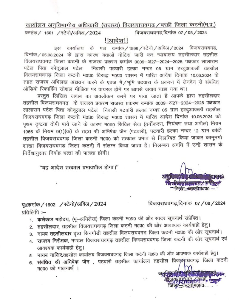 न्यायालय तहसीलदार, तहसील विजयराघवगढ़ जिला कटनी के राजस्व प्रकरण में पक्षकार लालाराम पटेल पिता कोदूलाल पटेल निवासी ग्राम हरदुआ कलॉ तहसील विजयराघवगढ़ विरूद्ध मध्यप्रदेश शासन प्रकरण मे 10 जून 2024 को पारित आदेश में भूमि बंटवारा के प्रकरण मे राजस्व अभिलेख अद्यतन करनें के एवज में लेनदेन से संबंधित ऑडियो रिकार्डिंग सोशल मीडिया मे वायरल होने पर पटवारी अभिषेक जैन को कारण बताओ सूचना पत्र जारी किया गया था।