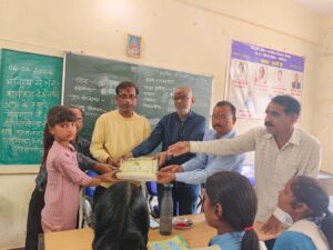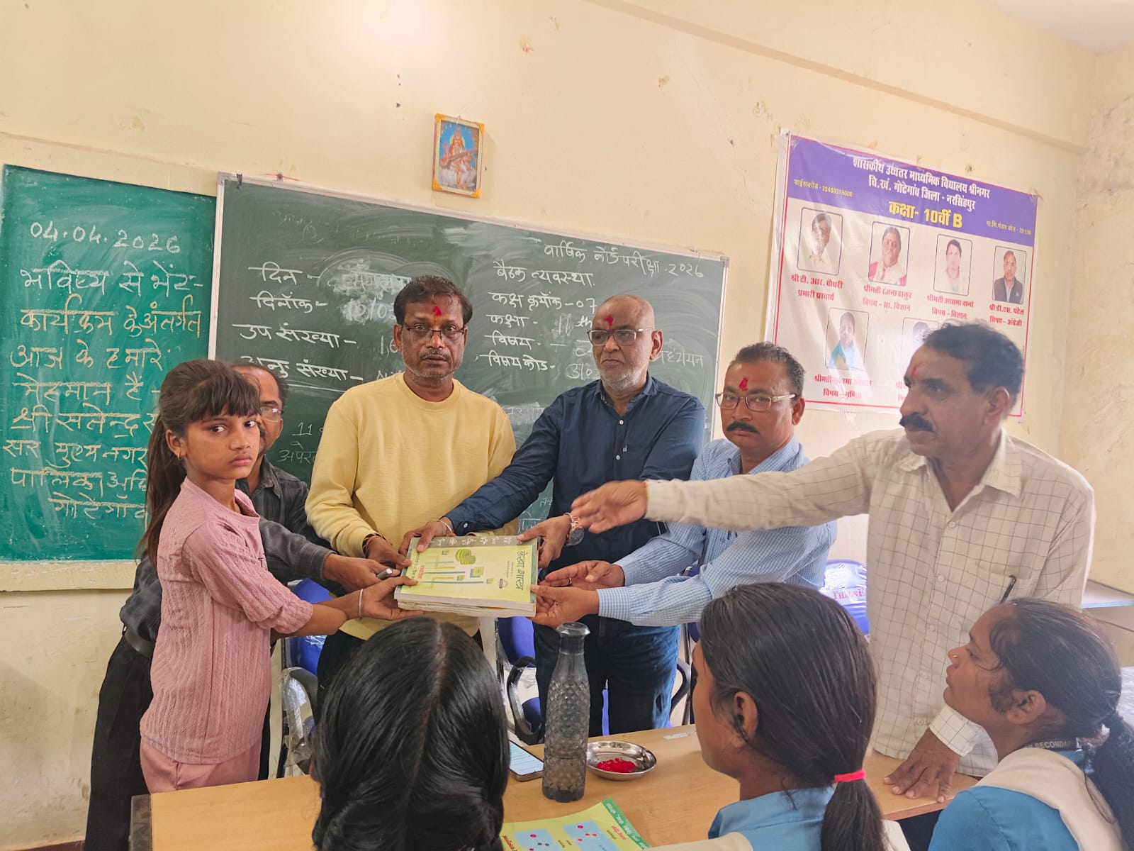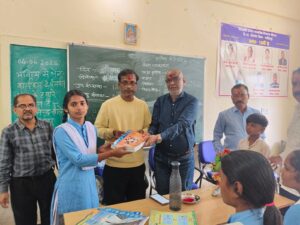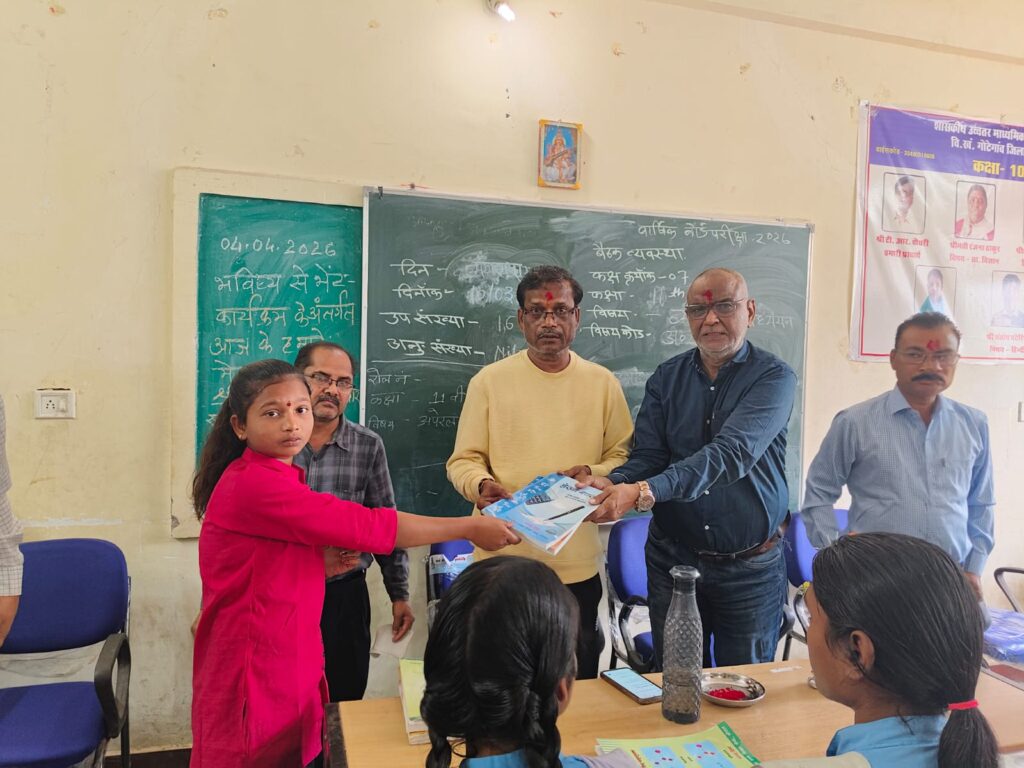 नरसिंहपुर। गोटेगांव में विगत दिवस विकासखंड अंतर्गत शासकीय उच्चतर माध्यमिक शाला, श्रीनगर (जिला नरसिंहपुर) में मध्यप्रदेश शासन, स्कूल शिक्षा विभाग के निर्देशानुसार एवं समग्र शिक्षा अभियान जिला शिक्षा केंद्र नरसिंहपुर के मार्गदर्शन में ‘भविष्य से भेंट’ एवं ‘स्कूल चले हम’ अभियान के अंतर्गत नि:शुल्क पाठ्य पुस्तक वितरण कार्यक्रम आयोजित किया गया।इस कार्यक्रम में नगर पालिका परिषद गोटेगांव के मुख्य नगर पालिका अधिकारी सतेन्द्र सालवार मुख्य अतिथि के रूप में उपस्थित रहे। उन्होंने विद्यालय में एक पीरियड का अध्यापन कार्य कर विद्यार्थियों को शिक्षा के महत्व से अवगत कराया। साथ ही उनके उज्ज्वल भविष्य के लिए प्रेरित किया। विद्यार्थियों को नि:शुल्क पाठ्य पुस्तकों का वितरण कर कैरियर संबंधी मार्गदर्शन भी प्रदान किया।