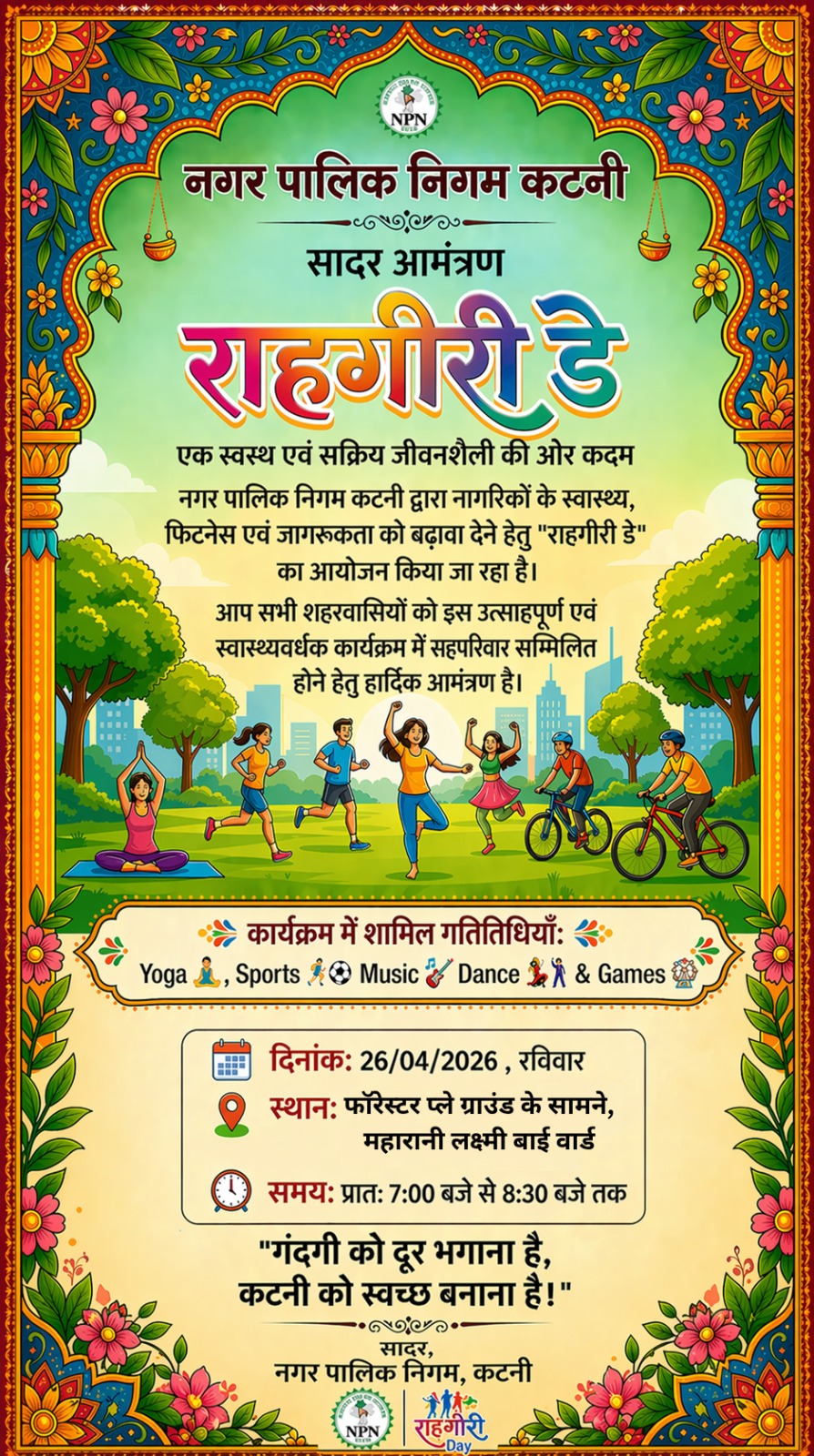 कटनी।कटनी शहर में स्वच्छता के प्रति जन जागरूकता बढ़ाने और नागरिकों को स्वस्थ जीवनशैली के लिए प्रेरित करने के उद्देश्य से नगर निगम प्रशासन एक अनूठी पहल करने जा रहा है। इसी कड़ी में रविवार 26 अप्रैल को सुबह 7:00 बजे से 8:30 बजे तक महारानी लक्ष्मी बाई वार्ड स्थित फॉरेस्टर प्लेग्राउंड के सामने “राहगीरी डे” का भव्य आयोजन किया जाएगा।